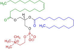 Fosfatidylcholin (PC, někdy též lecithin) je fosfolipid (konkrétně glycerolfosfolipid), který je důležitou složkou eukaryotních obou listů buněčných membrán (v erytrocytu asi 10 hm. %, v mitochondriální membráně dokonce 39%[1]). Navíc je to významný zdroj druhého posla DAG a dalších signálních molekul. Tvorba DAG z fosfatidylcholinu však trvá pomaleji, než z fosfatidylinositol-4,5-bisfosfátu (PIP2), přibližně v řádu minut po obdržení signálu buňkou. Z dalších signálních molekul je možné jmenovat kyselinu arachidonovou, která vzniká rozkladem fosfatidylcholinu fosfolipázou A2, nebo kyselinu lysofosfatidovou i třeba faktor ovlivňující destičky (PAF).[2] Biosyntéza fosfatidylcholinu probíhá v několika krocích: nejprve je cholin fosforylován na fosfocholin za spotřeby ATP, následně je pomocí CTP vytvořen CDP-cholin a nakonec je CMP zbytek vyměněn za nějaký 1,2-diacylglycerol. Také je ale možné vytvořit v játrech fosfatidylcholin trojitou methylací fosfatidylethanolaminu.[1]