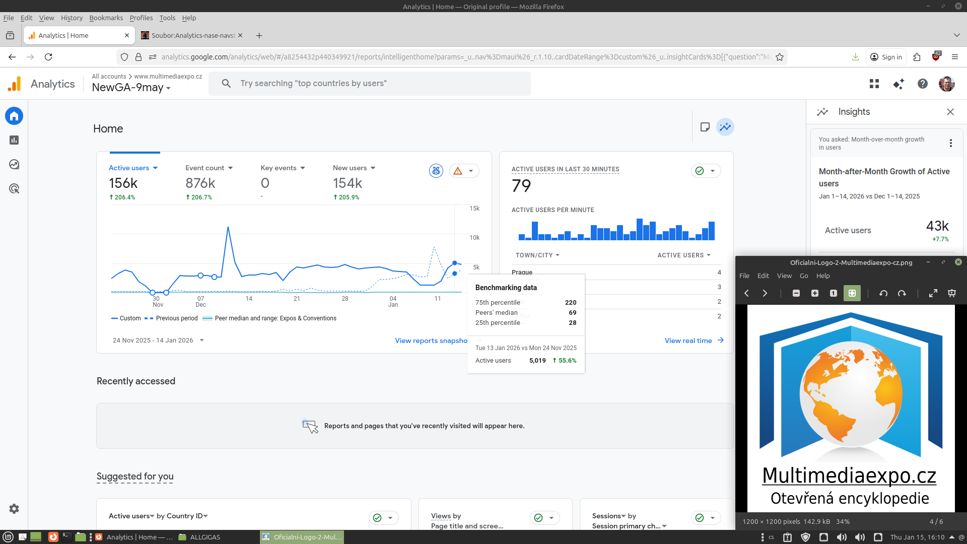 Snímek výřezu webových stránek + serveru GA – Google Analytics (analytics.google.com) ukazuje rychle rostoucí mezinárodní návštěvnost naší encyklopedie.