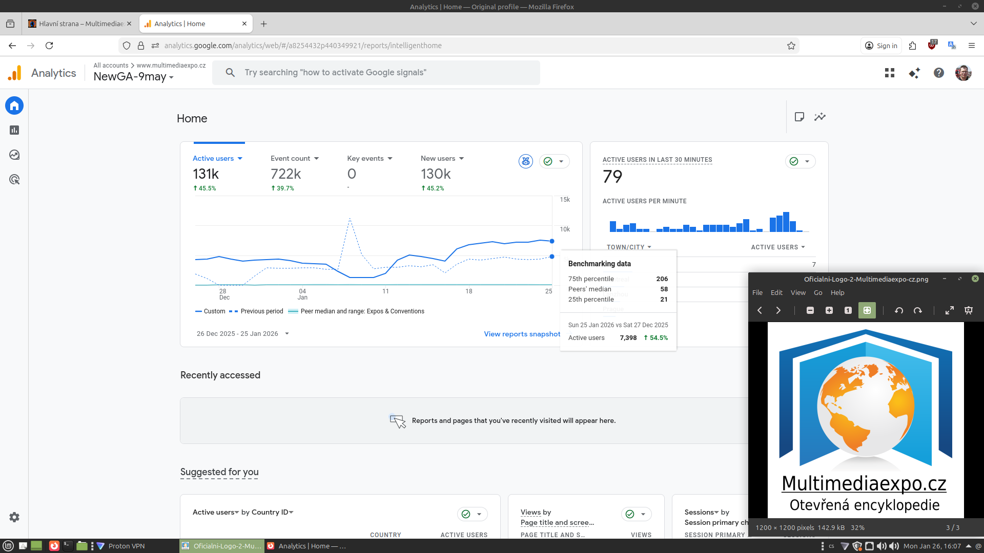 Snímek výřezu webových stránek + serveru GA – Google Analytics (analytics.google.com) ukazuje rychle rostoucí mezinárodní návštěvnost naší encyklopedie.