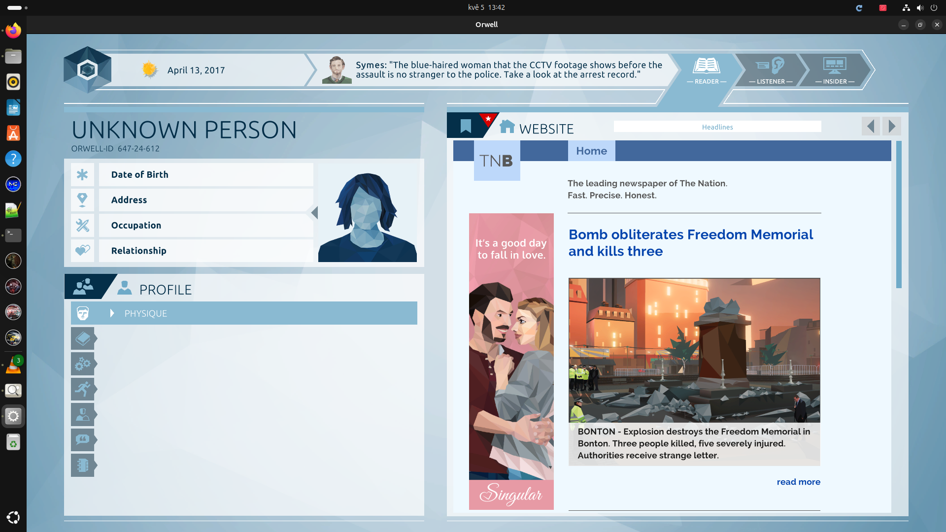 současná5. 5. 2025, 12:40Náhled verze z 5. 5. 2025, 12:401 920×1 080 (612 kB)Sysop (diskuse | příspěvky) (Snímek obrazovky + Czech: grafické prostředí '''Ubuntu verze 24.04.2 Noble Numbat LTS'''...je velmi přitažlivé. * Skvělá hra – '''Orwell''' * GOG.com — '''https://www.gog.com/en/game/orwell''' + pochází z mojí nejlepší pracovní stanice)