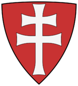 Do heraldiky se dvojramenný kříž dostal až v roce 1190, kdy uherský král Béla III. Uherský (1172–1196) zavedl znak zobrazující stříbrný dvojramenný kříž na červeném štítu, bez dalších heraldických figur a tento znak nechal rovněž razit na uherské mince. Král si kříž do svého království přivezl z Byzantské říše, kde dlouho pobýval a dokonce se tam i oženil s dcerou císaře.[5]