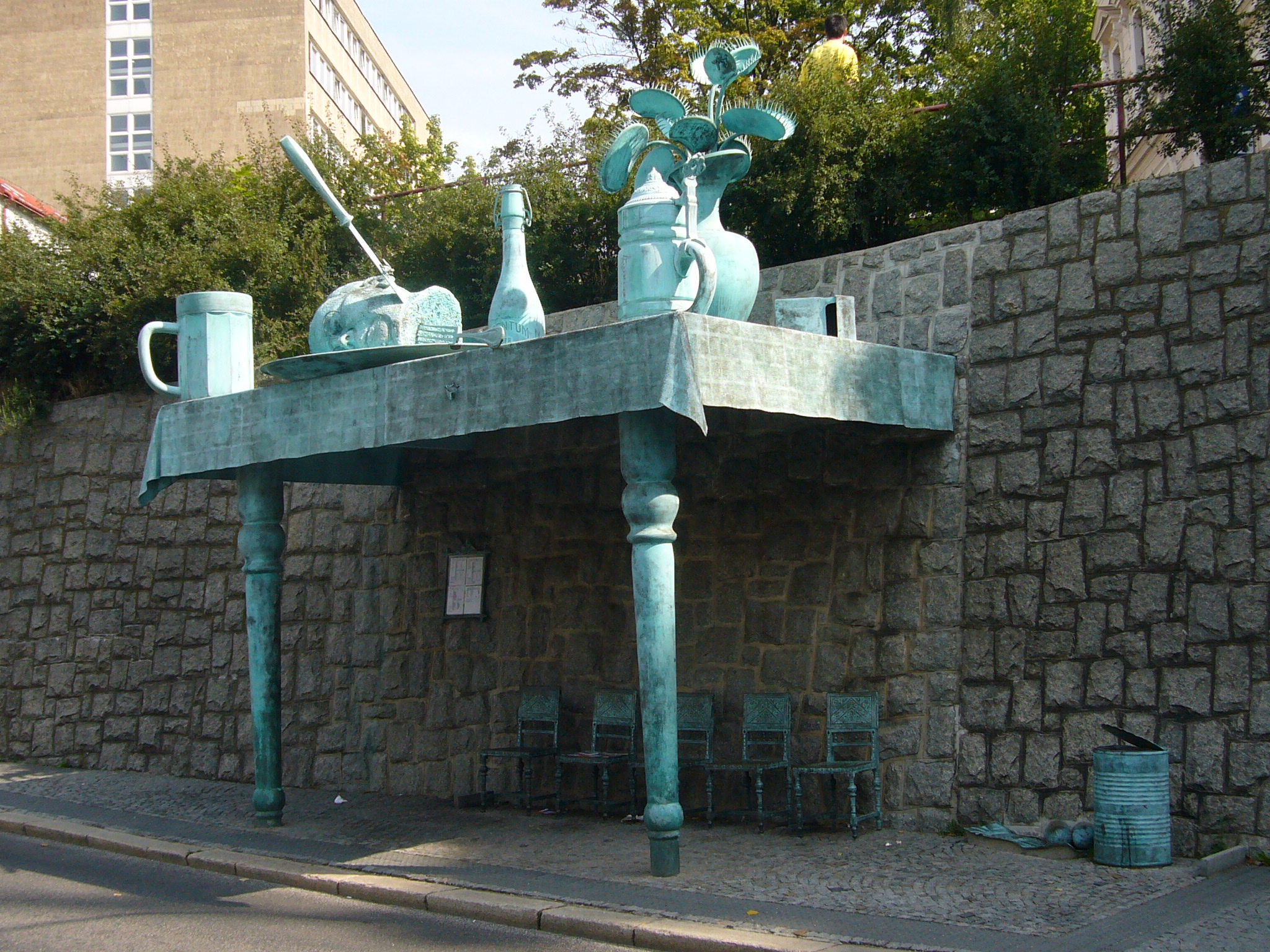 - English: "Feast of Giants". The bus shelter "Sokolská u zdi" in Liberec (the Czech Republic) by David Černý, fixtured 2005, brass.