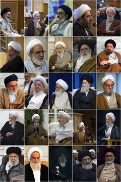 | - | '''Ájatolláh''', často přepisováno i jako '''ajatolláh''' ([[Perština|persky]] {{Cizojazyčně|fa|'''آیتالله'''}}, [[Arabština|arabsky]] {{Cizojazyčně|ar| '''آية الله'''}} = ''znamení Alláhovo''), je nejvyšší hodností, jaké může v [[ | + | [[Soubor:Grand Ayatollahs Qom فتوکلاژ، آیت الله های ایران-قم 02.jpg|thumb|240px|Velcí ájatolláhové]] |