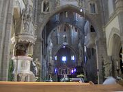 Do vnitřku kostela proudí světlo z každé strany hlavní lodi šesti lomenými horními okny. Tentýž počet oken mají i boční lodi. Třístěnná velká apsida hlavní lodi je zdobena třemi kruhovými okny. Z nich je nejcennější okno prostřední, růžicové, svým ztvárněním (avšak nikoli velikostí) podobné tomu v katedrále Notre-Dame v Remeši.[11] Zajímavostí je, že všechna tato okna byla až do roku 1871 zazděna, současně s odkrytím těchto oken dostala obě boční okna jednoduchou plaménkovou kružbu.