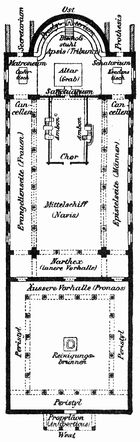 • orientální, která měla vchod (nebo vchody) na delší straně a její interiér byl rozdělen na střední loď a průchod, který vedl okolo ní,
