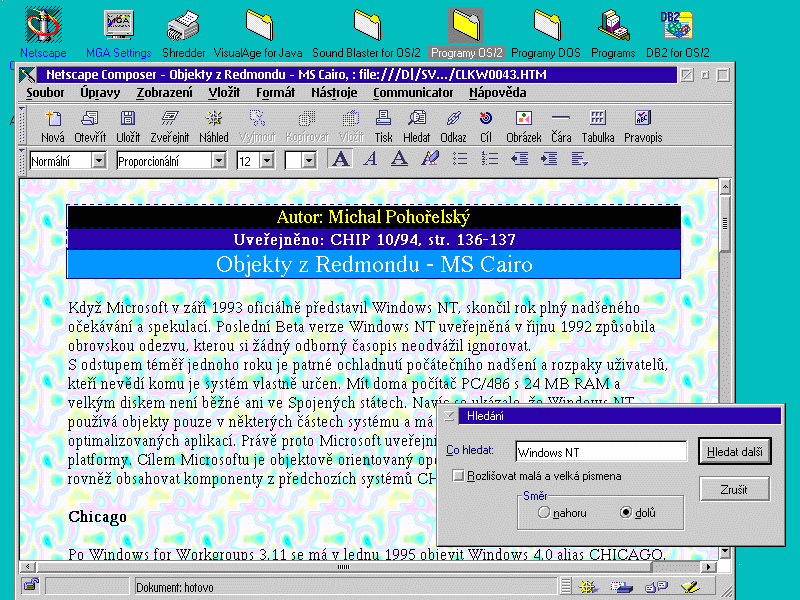 Vlastní snímek operačního systému + OS/2 Merlin 4.0 a grafického HTML editoru Netscape Composer + pochází z jednoho z mých starých počítačů a byl součástí recenze pro český počítačový časopis CHIP.